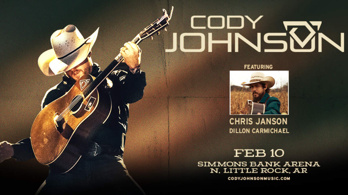 The one and only Cody Johnson is coming to Simmons Bank Arena on February 10th with special guests Chris Janson and Dillon Carmichael! Doors open at 6:30pm and the show starts at 7:30pm. Tickets on sale starting Friday, October 6th at 10am at Ticketmaster.com