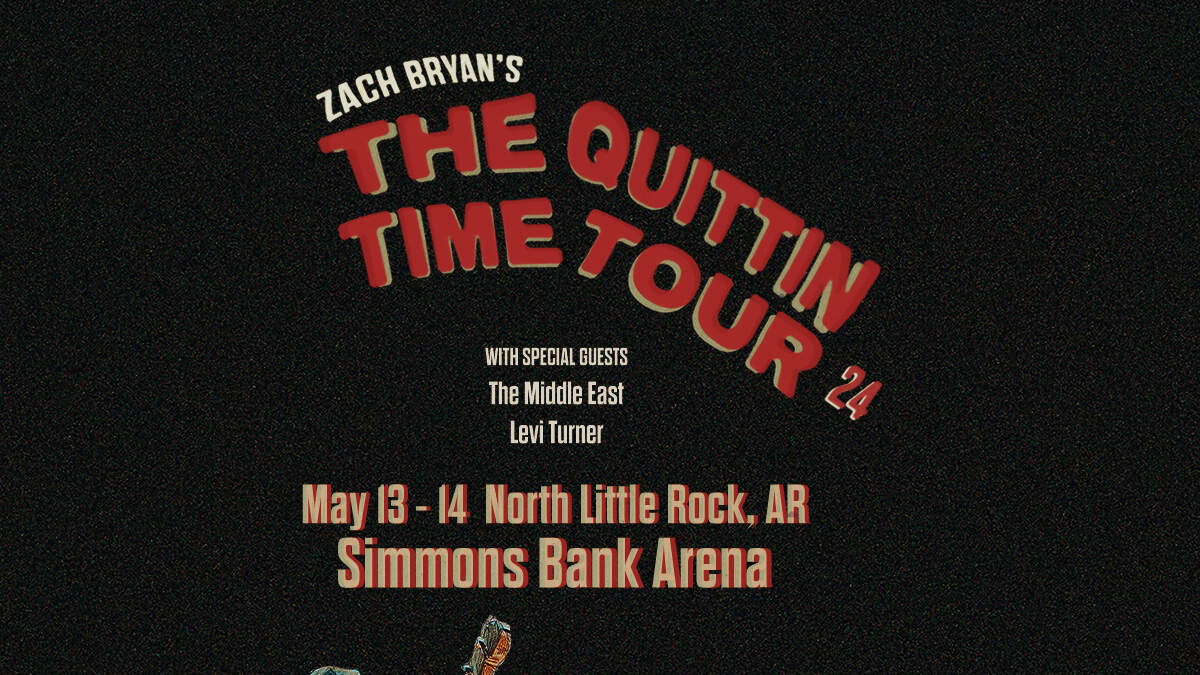 Zach Bryan is coming to North Little Rock for his The Quittin Time Tour with special guests The Middle East and Levi Turner on May 13th and 14th to Simmons Bank Arena! Tickets go on sale to the general public on Friday, September 8th at 12pm at Ticketmaster.com or the Simmons Bank Arena Box Office.